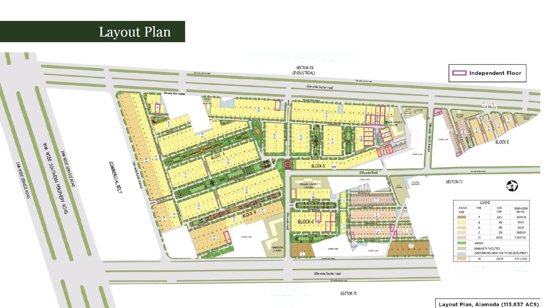 In the residential plots of DLF Alameda Plots, for the size 250/538 sq yd/700 Sqyrd/ 1000 Squad. there are 4 blocks A, B, C, D. Others consist of roads like central avenue, South avenue, West avenue, etc. Different plots of the project have varying booking prices but mostly are booked within 54000 INR per sq yard