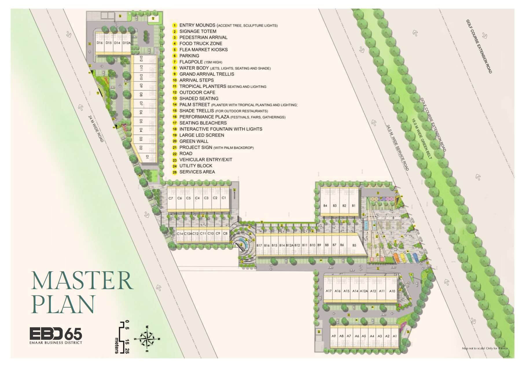 Disclaimer : Nothing contained herein intends to constitute a legal offer and does not form part of any legally binding agreement. All images are merely artistic conceptualization and does not replicate the exact product or development and should not be relied upon as definitive reference.Emaar Business District - 65 (EBD-65) is a commercial plotted colony project having RERA regn. No. RC/REP/HARERA/GGM/409/141/2020/25 dated 15.09.2020 and is being developed on land presently admeasuring 5.7354 acres owned by Active Promoters Private Limited and Balalaika Builders Private Limited in collaboration with Emaar MGF Land Limited. Development is subject to terms and conditions of 1. License No. 20 of 2020.
