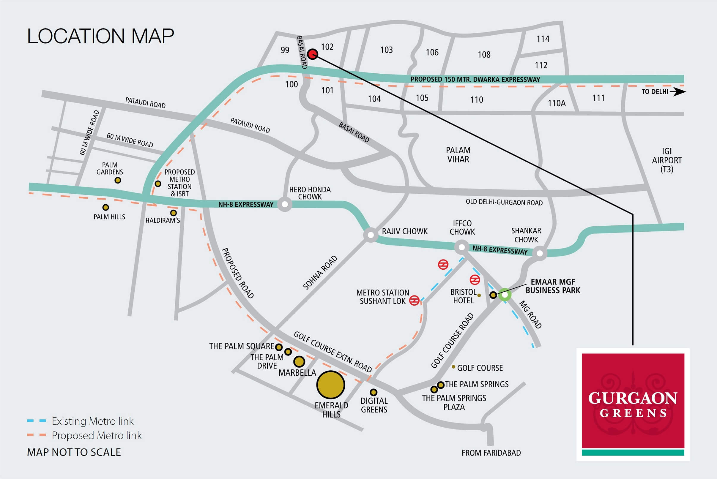 Emaar Gurgaon Greens sprawls across over 13.5 acres of land. It is located on the existing State Highway and is in the vicinity of the upcoming Dwarka Expressway with convenient access to NH 8 and Delhi (Dwarka) With 642 apartments and 30 penthouse apartments it has only 2 apartments per floor with 2 dedicated lifts which gives a sense of exclusivity and privacy. With 3BHK and 4BHK apartments, sizes vary from 1650 sq ft to 3200 sq ft respectively.