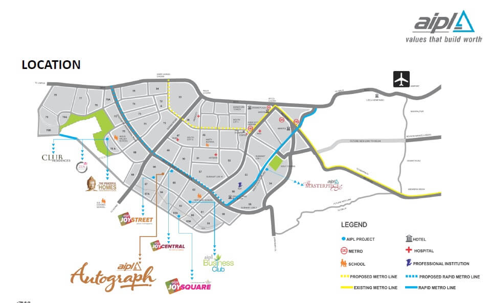 The Autograph Is Elevated Almost 1.2 Metres Above The Perimeter Access Road. Aipl Autograph Has A Spacious Work Area To Choose Between 4400 And 11000 Square Feet, Perfect For Any Commercial Space. Across The Three Humongous Towers With G+12, G+5, And G+8 Inter-Connected With A Common Central Square Lawn. The Rooftop Of 20,000 Sq. Ft Has A Triple-Top Lobby And Lounge Area. The Ground Floor Is A Retailing Area And An Exhibition Area. As You Reach The Second Floor From The Third Floor Office Area You Will Find The Food Court, The Best-Loved Space. As A Result, The Whole Space Seems Marvelous. The Aipl Autograph Is A Unique, Distinctive, And High-Quality Business Sector.