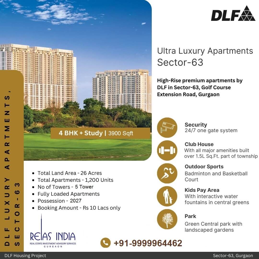 DLF The Arbour offers 4 BHK ultra-Luxurious Apartments in Sector 63 Gurgaon and welcome you in extravagant life. It would be a biggest ultra-luxurious Residential property at Golf Course Extension Road. DLF Group Offers you 4 BHK High End ultra-luxury Flats. A home where you get Fun and comfort at all of these flats comes with open-air balconies with landscapes green views. DLF Sector 63 is a new world of your dream home and provides you a breathtaking view. DLF Sector 63 Gurgaon Presenting a Lavish Residential community. DLF Group is providing 4 BHK ultra-Luxurious Apartments. The floor layout of 4BHK flat comes with Bedrooms, toilets, living area, kitchen and balcony. The floor plan completely ventilated with air and sunlight. DLF delivering a best project the developer builds a masterpiece that surly gives you much better life with luxury, comfort and happiness. DLF Sector 63 Gurgaon has everything unites to get ultra-luxury house from design to execute everything realty of each resident, DLF deliver imaginations of every resident it's an ideal choice of families.