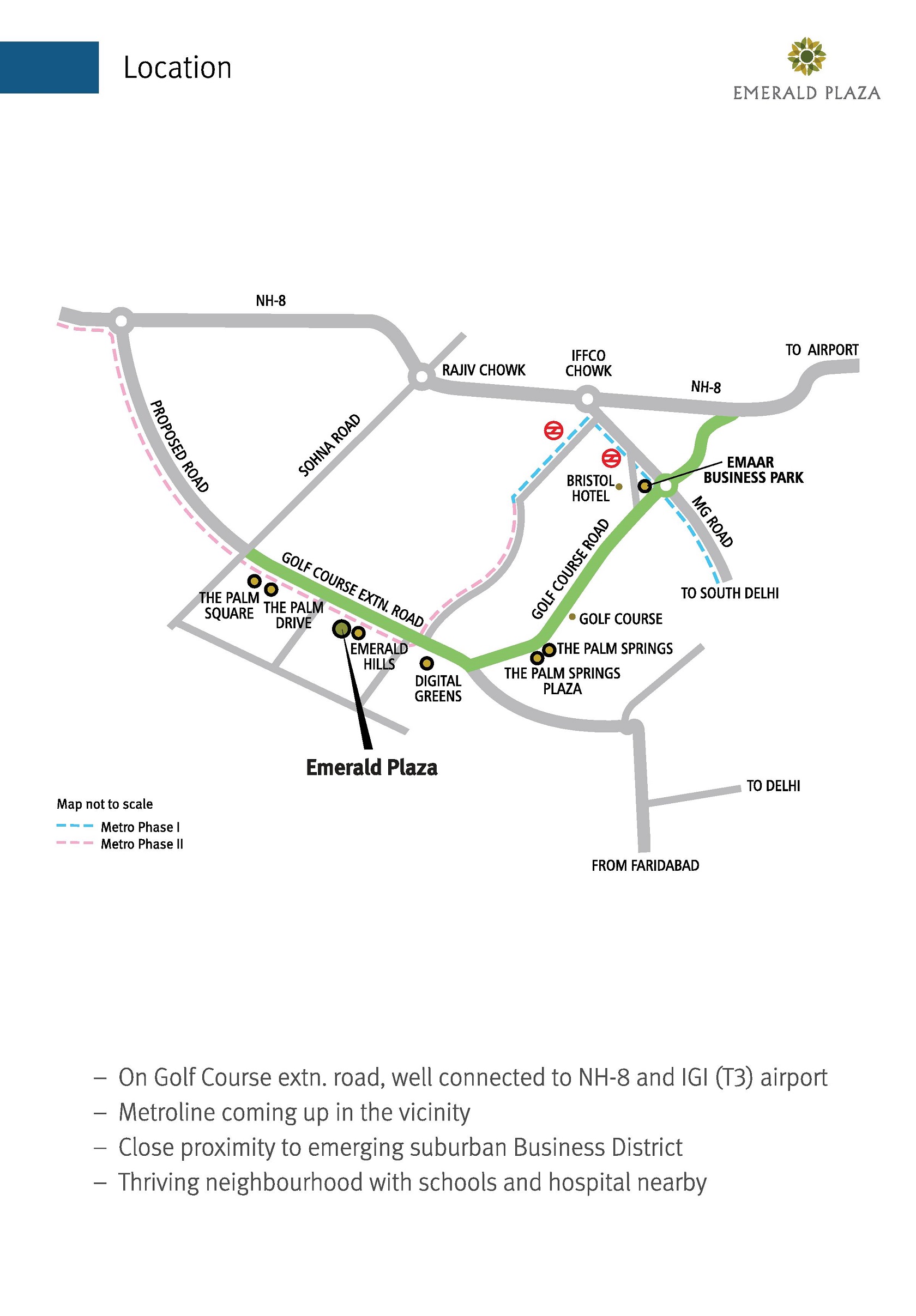 The Emerald Plaza Is In Close Touch With Carefully Crafted Residential Space That Caters To A Polished Consumer Base. The Living Standards And Facilities Will Be Kept At High International Standards Much Like Most Other Developments Of Emaar Mgf. On View Would Be Great Attention To Design And Detail And A Unique Concept Where The Exterior Massing Complements The Interior Courtyard. Added To This Is The Close Proximity Of The Plaza To An Up Market Residential Community With A Captive Consumer Base. Facilities And Quality Standards Will Be World Class, A Feature Common To All Emaar Mgf Developments. Emerald Plaza Commercial Project Will Cater To The Needs Of The 200 Acres Of Surrounding Residential Project Like M3M Golf Estate, Emerald Floors, Emerald Estate, Emerald Floors Premier Etc,Emerald Plaza Location Will Be Just Few Meter From Proposed Metro Station.
