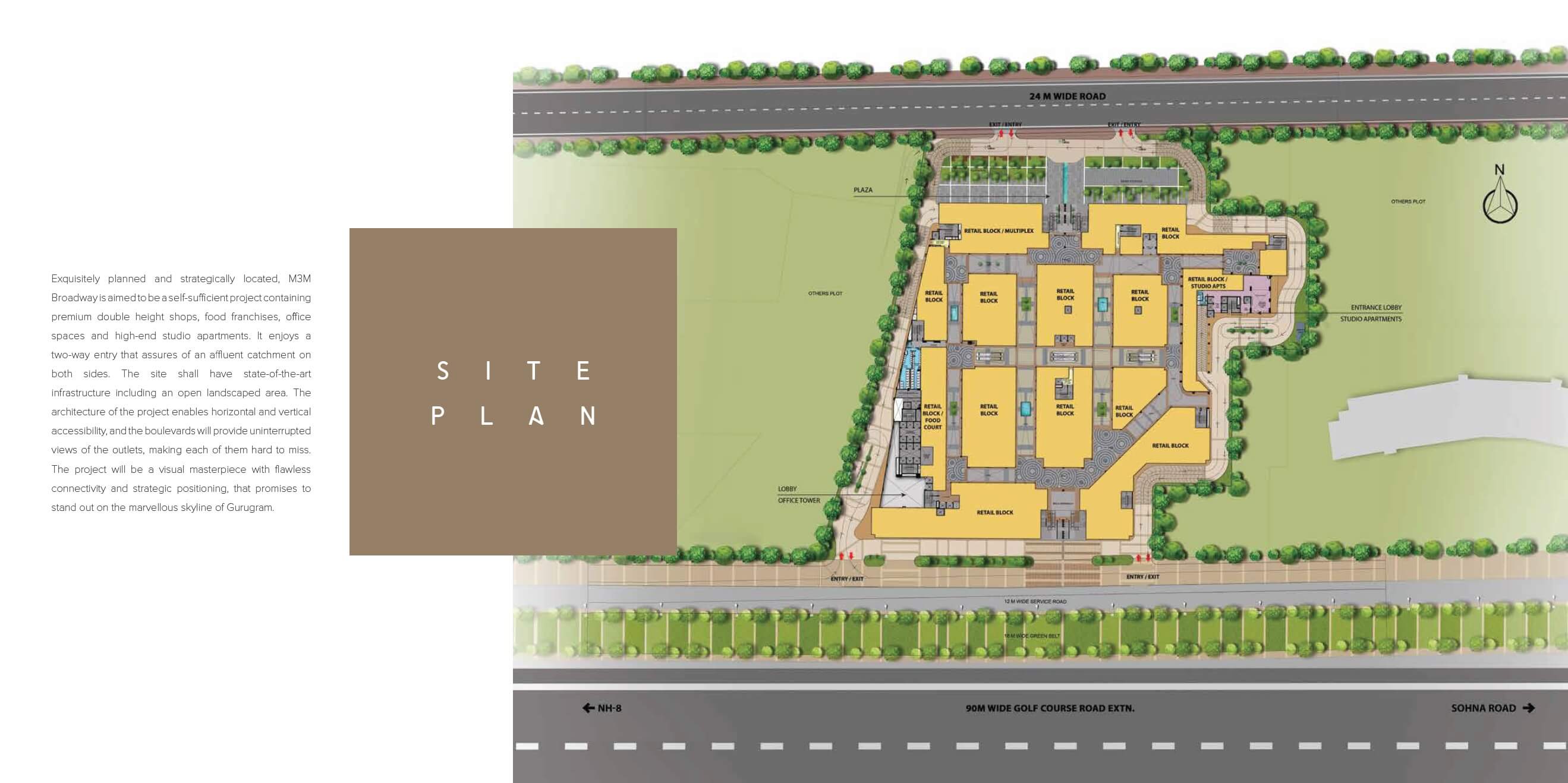 M3m New Commercial Broadway Is A Unique, One-Of-Its-Kind Project That Offers A Heady Mix Of High-End Retail Shops, World-Class Commercial Spaces (Ground +22 Storied), Studio Apartments(Ground +12), Multiplex On the 3rd & 4th Floor, a Game Zone, Fun Zone On 3rd Floor, Terraces Restaurant On First, Second Floors. M3m New Commercial Sector 71 Enjoying An Awesome Location With Exclusive Two-Side Access, M3m Commercial Has Set A New Precedent Of Affluence And Exuberance In The City Of Gurugram.
