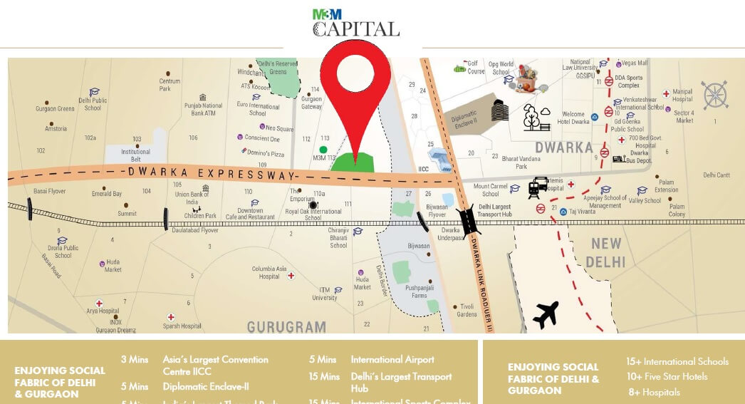 The M3M Capital has unique features like exclusive golf-courses, private foyer, green landscape, and separate yoga & meditation area. It also has a 60,000 square feet Clubhouse which is one of the largest on the Dwarka Expressway.At present, 5 towers are being built in the project area of about 16 acres. To be located on the 200 meter wide road on Dwarka Expressway, M3M Capital would also have good connectivity with India International Convention Centre and Diplomatic Enclave.