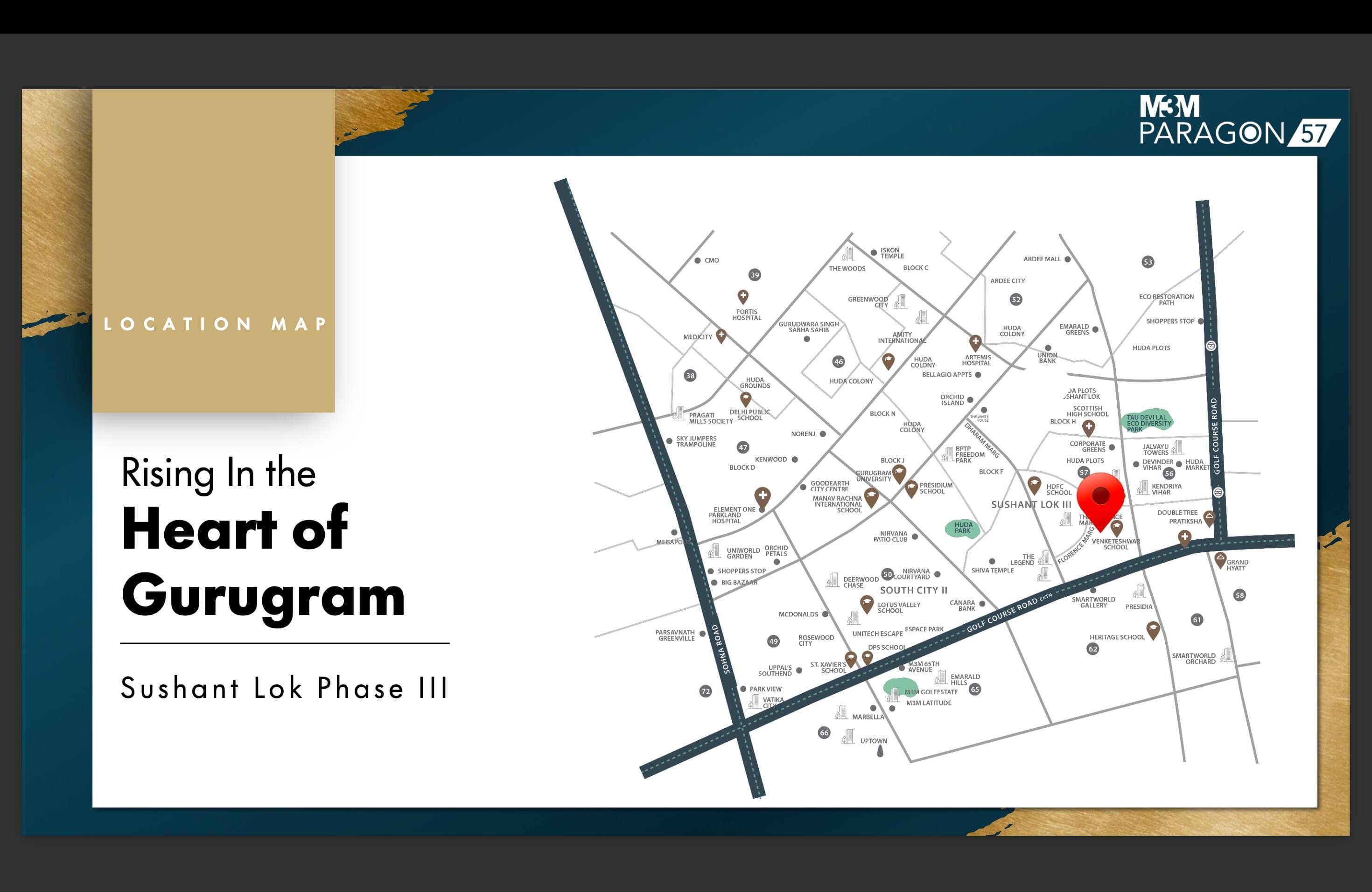 The M3M Paragon Sector 57 is well connected to many significant financial, commercial, and residential hubs of the NCR region. The project is coming in a densely populated region which brings a lot of business opportunities for the property owners. The project enjoys very close proximity to the Golf Course Extension Road expressway connecting IGI Airport and Gurgaon.